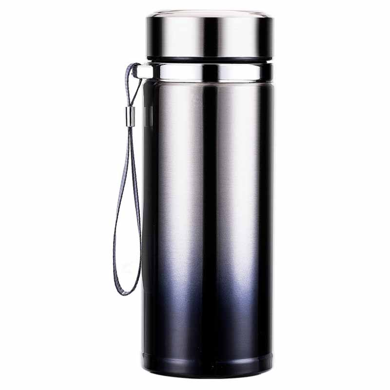 Su apariencia cautiva instantáneamente con una sofisticación: la textura nítida del acero inoxidable está envuelta en un lavado degradado que va del plateado al azul profundo del océano, como si el cielo estrellado hubiera sido tejido en la taza. Brilla con un brillo sutil bajo diferentes luces; Combinado con una tapa metálica a juego y un cordón minimalista, es un discreto punto focal en su viaje diario, un accesorio de buen gusto en entornos comerciales e incluso su agarre frío al tacto irradia una sensación de calidad.
