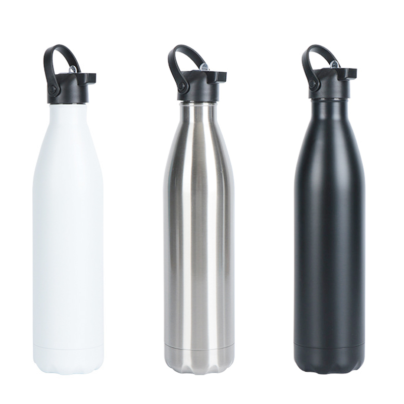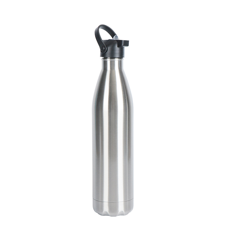 Esta es una botella de agua de acero inoxidable de 750 ml. Tiene una apariencia elegante y metálica y un mango negro en la tapa para facilitar el transporte, adecuado para varias ocasiones como actividades al aire libre o uso diario.
