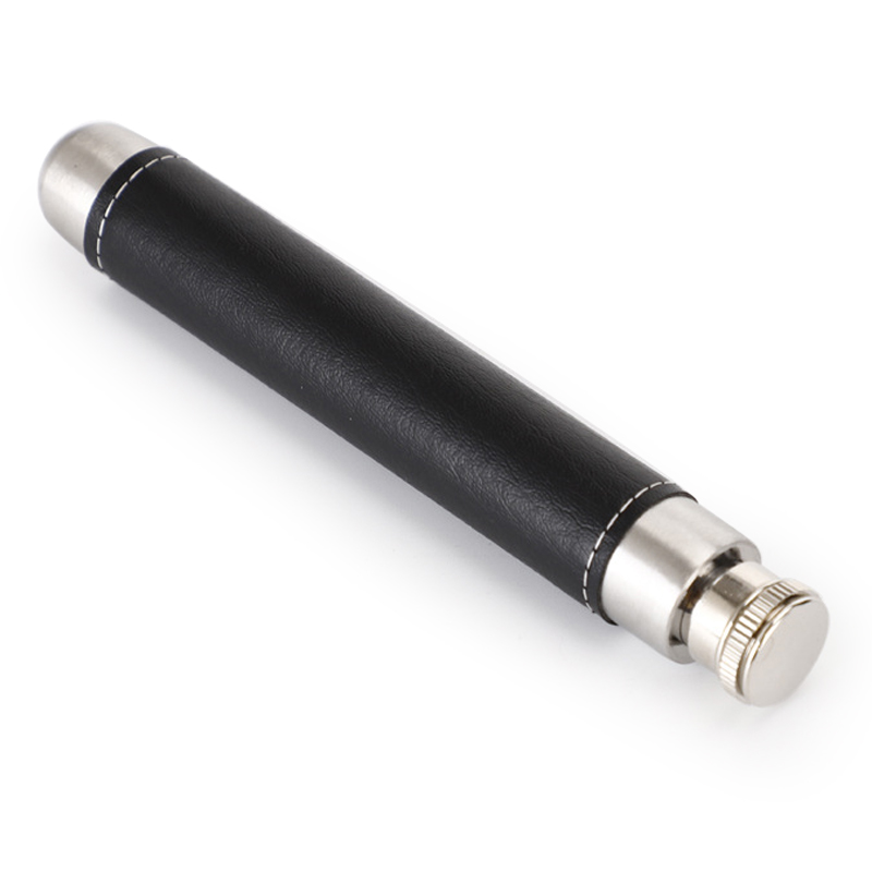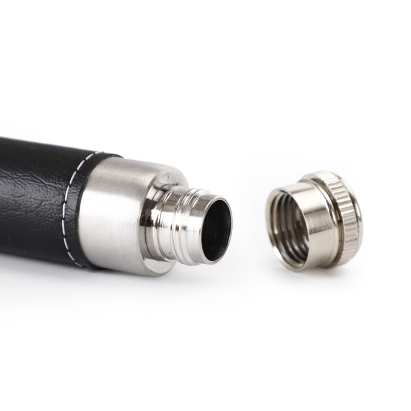 Esta ilustración detallada muestra el tubo de vino portátil de acero inoxidable con su distintivo revestimiento de cuero negro. El pico de metal y el tapón de rosca ingeniosamente diseñados demuestran una artesanía meticulosa. La estructura de tornillo diseñada con precisión garantiza un sellado hermético contra fugas, lo que lo hace ideal para el almacenamiento de vino al aire libre y, al mismo tiempo, ofrece un funcionamiento suave gracias a su diseño ergonómico. Esta combinación ofrece practicidad y calidad superior en un paquete elegante.