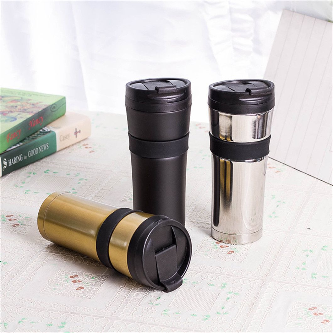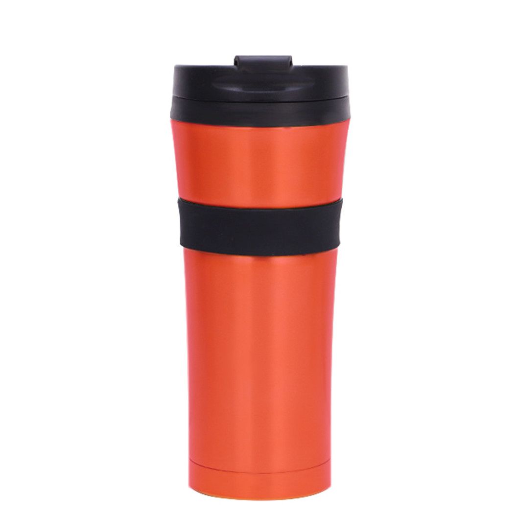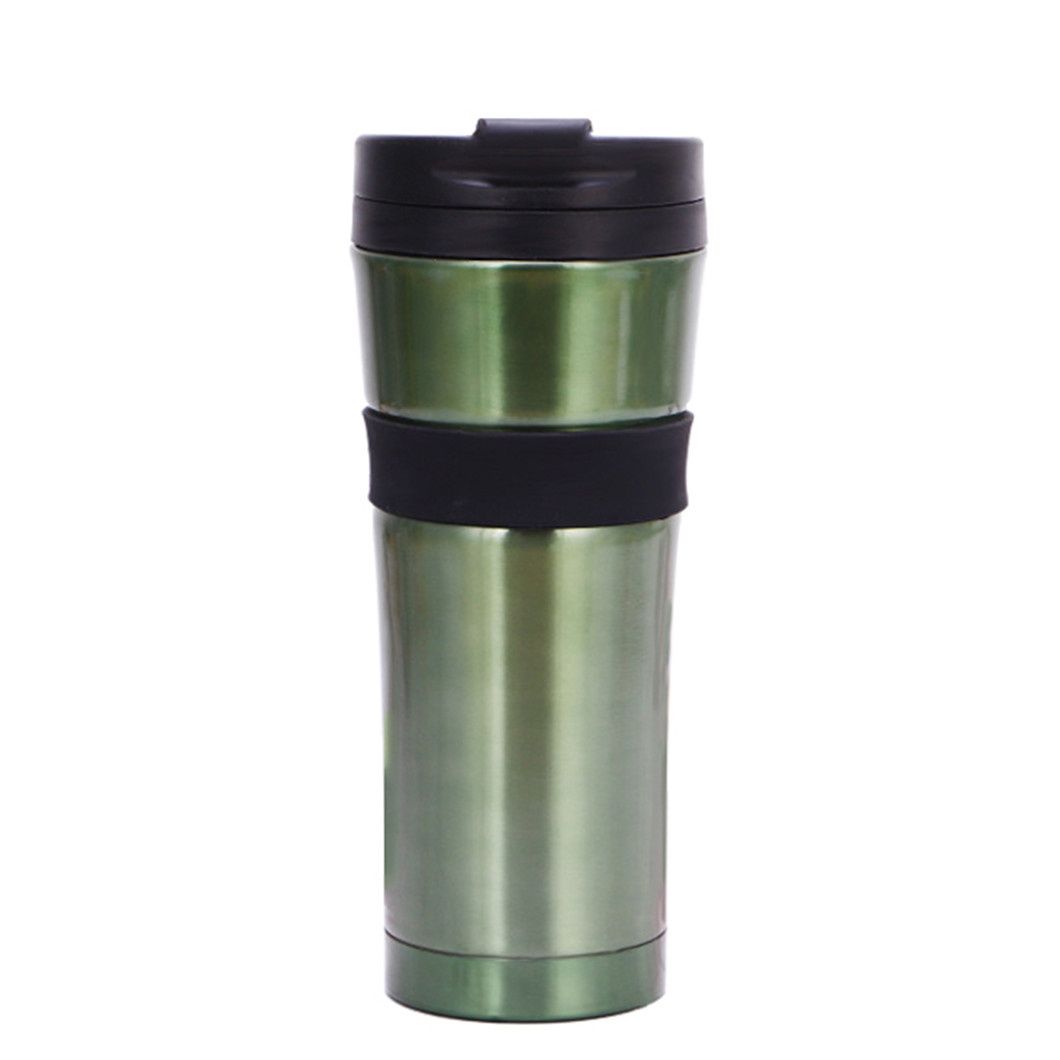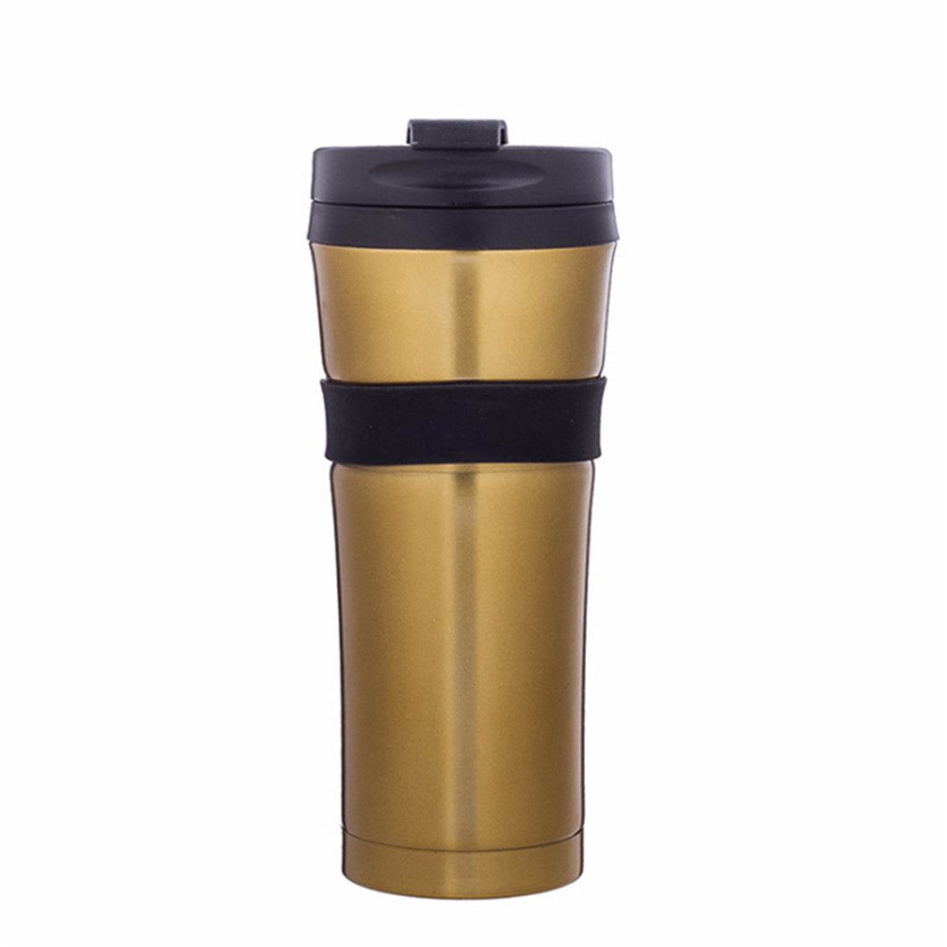 Este termo de acero inoxidable viene en acabados dorados, negros y plateados, con opciones de personalización disponibles. Con una elegante tapa negra y un anillo de goma negro duradero en el centro que evita el resbalón y protege la taza, es perfecto para llevar sus bebidas diarias como café o agua caliente.